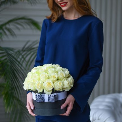 #.79 Hat box with flowers ”Lady of the flowers: 31 white roses in a hatbox”