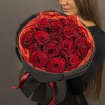A bouquet in classic tones with fresh cut flowers. Red and black, a bright and bold combination, a great gift for stylish and bright girls. The bouquet is carefully packed and tied with satin ribbons. Also included with the bouquet is a product for prolonging the durability of flowers with instructions for use.