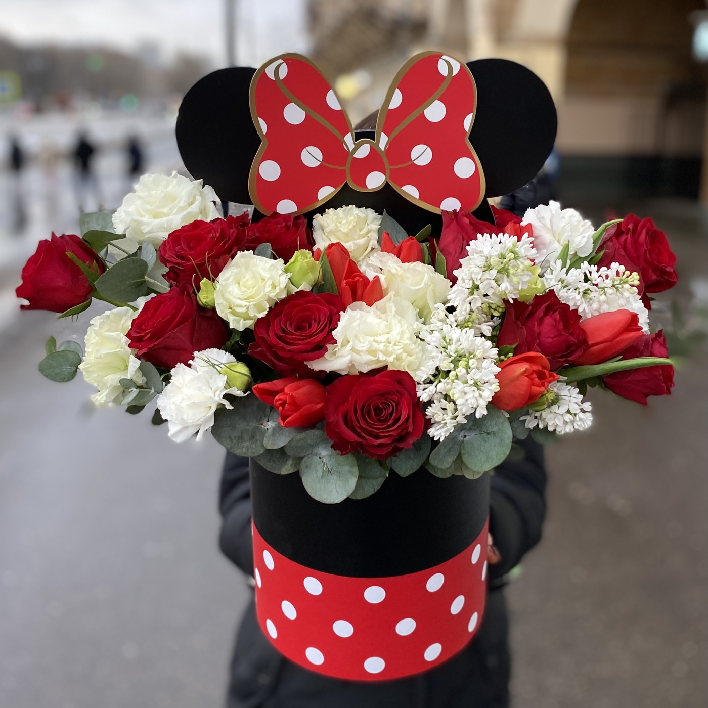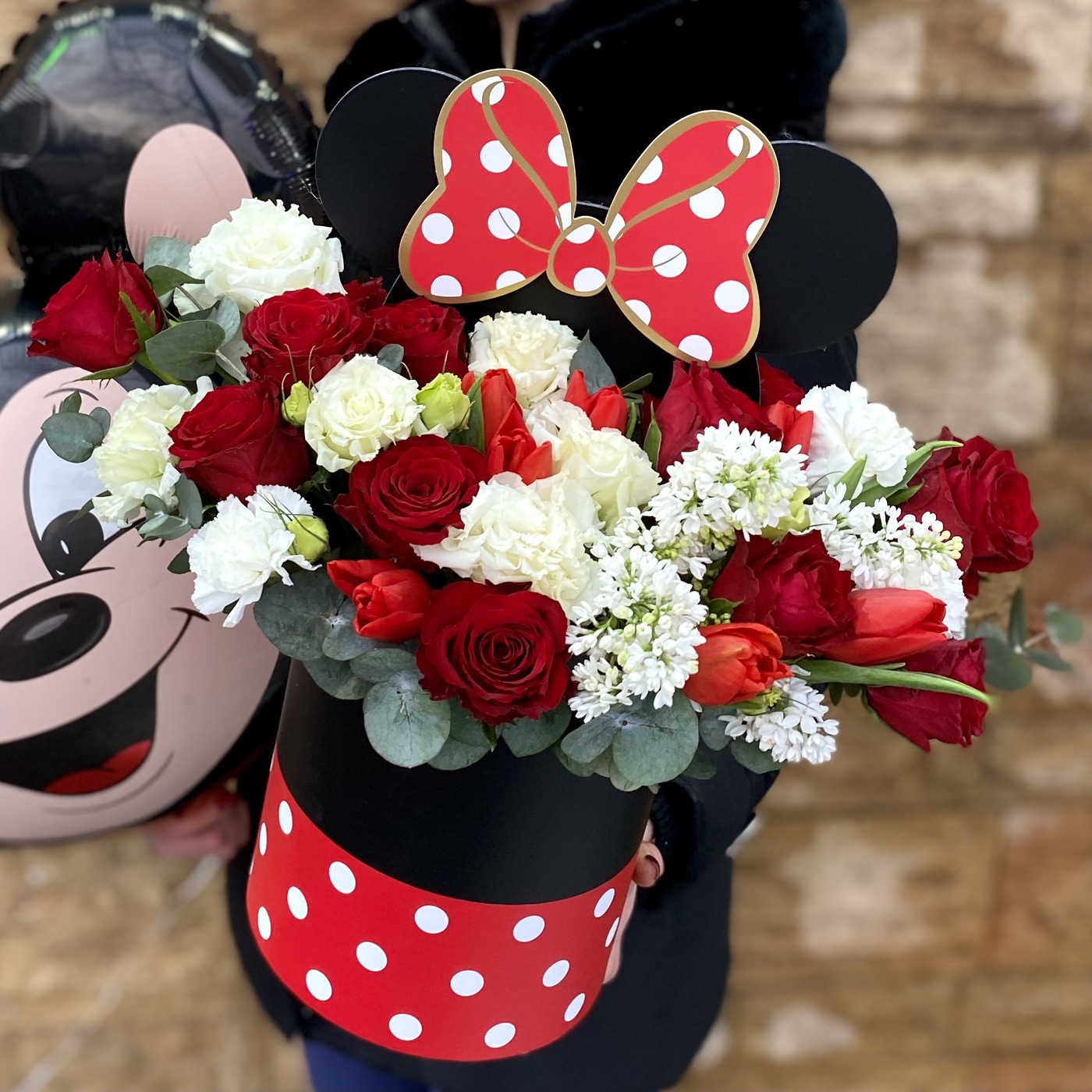 A bright contrasting fragrant composition in a Mickey Mouse hat box will delight every girl, girl, and woman. Complement the flowers with balloons to match the composition and make a lasting impression on the recipient.