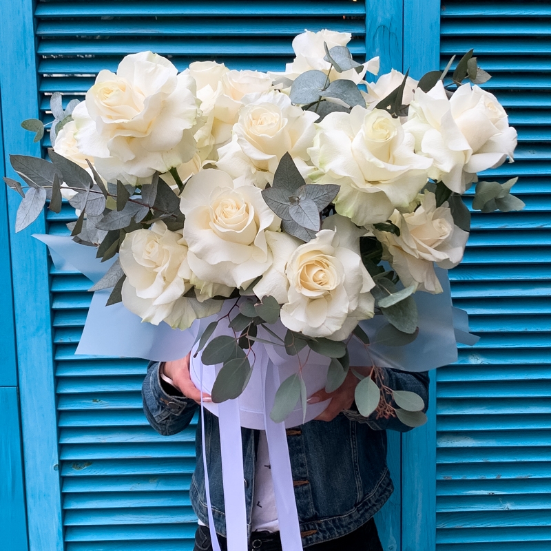 Beautiful arrangement in a hat box with white roses and eucalyptus