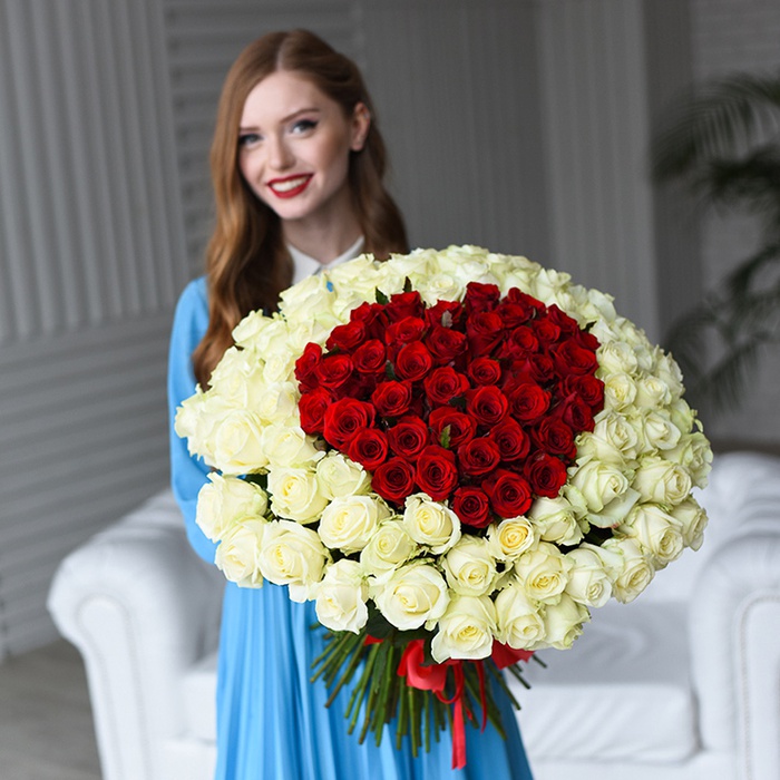 A bouquet of 111 red and white roses is the embodiment of passion and tenderness, the perfect gift for any occasion. This bouquet will be a wonderful choice for Valentine’s Day, a wedding anniversary, or simply a desire to please a loved one. The combination of red and white roses symbolizes the harmony of love and respect, passion and tenderness. Such a bouquet will be a beautiful decoration for any interior and will fill it with a subtle fragrance. A bouquet of 111 red and white roses will be a wonderful gift for any occasion. It will bring joy and happiness, as well as leave pleasant memories for a long time. Order a bouquet of 111 red and white roses right now and give unforgettable emotions with delivery right to the door. Your choice is a guarantee of quality and freshness, as we care for each bouquet as if it were our own gift.