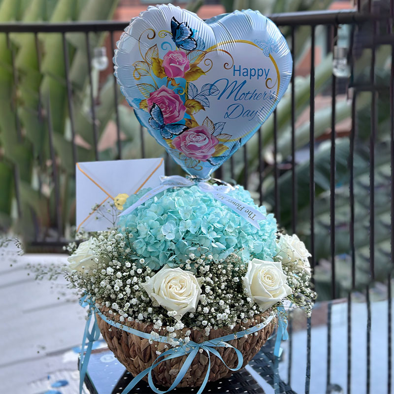 Our precious flower arrangement for Mother’s Day comes in a large size with a basket and balloon included )